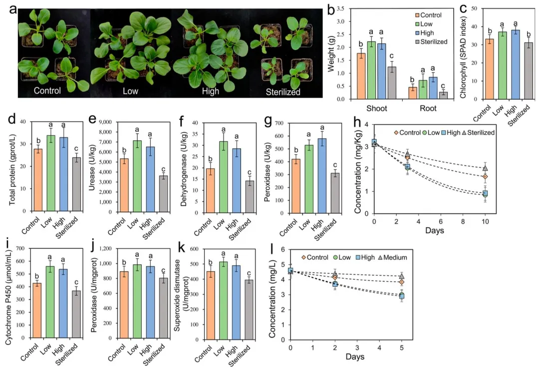 图 3 根际细菌群落结构改变后的反馈效应。(a) 重植植株的生长状况、(b) 重植植株的生物量(土壤分别取自低 / 高剂量吡虫啉处理组、对照组及低剂量吡虫啉处理组的灭菌土壤);(c) 重植植株地上部的叶绿素含量、(d) 重植植株地上部的总蛋白含量;重植植株根际土壤中的 (e) 脱氢酶活性、(f) 脲酶活性、(g) 过氧化物酶活性;经 10 mg/L 吡虫啉叶面喷施后,重植植株地上部的 (h) 吡虫啉残留量、(i) 细胞色素 P450 含量、(j) 过氧化物酶活性、(k) 超氧化物歧化酶活性;(l) 含低 / 高剂量吡虫啉处理组、对照组根际微生物的培养基及无添加根际微生物的空白培养基中的吡虫啉浓度。柱形图上不同字母表示组间存在统计学显著差异(方差分析结合杜凯检验,P<0.05)。叶绿素含量测定设置 20 次重复,其余指标测定均设置 6 次重复,误差棒代表标准差。