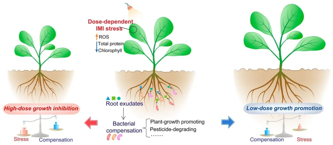 外源化学物质调控植物生长时往往呈现双相响应特征,即低剂量产生刺激效应、高剂量表现为抑制作用,但其内在作用机制尚未明确。本研究首次证实,根际微生物群具有补偿性功能,可助力植物抵御农药胁迫。研究发现,小白菜经低、高剂量吡虫啉叶面喷施处理后,根际细菌总数有所增加,且多种有益细菌得到富集,如诺卡氏菌属、短波单胞菌属、鞘氨醇单胞菌属等,这类细菌兼具植物促生和农药降解能力。受农药胁迫的小白菜会通过增加根系分泌物中初级代谢物(如氨基酸、脂肪酸、溶血磷脂酰胆碱)的释放,完成对上述有益细菌群落的招募。低剂量农药处理下,微生物的补偿效应可抵消农药胁迫作用,进而促进植物生长;而高剂量农药处理时,微生物的补偿效应不足以抗衡农药胁迫,最终导致植物生长受到抑制。本研究为制定优化的农药施用策略奠定了基础,也为深入理解如何利用根际微生物群、以生态友好的方式缓解作物的化学诱导胁迫提供了新的思路。