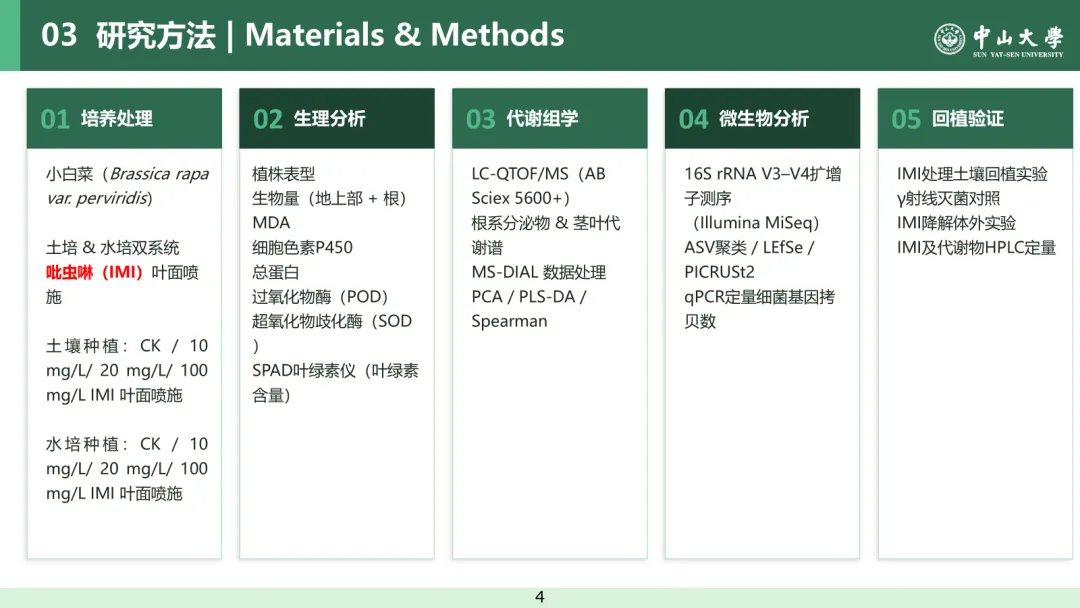 本研究采用土壤培养和水培培养双体系对比,结合生理、代谢组、微生物组和农药检测技术,辅以重植和体外降解验证实验,具体关键参数如下表: