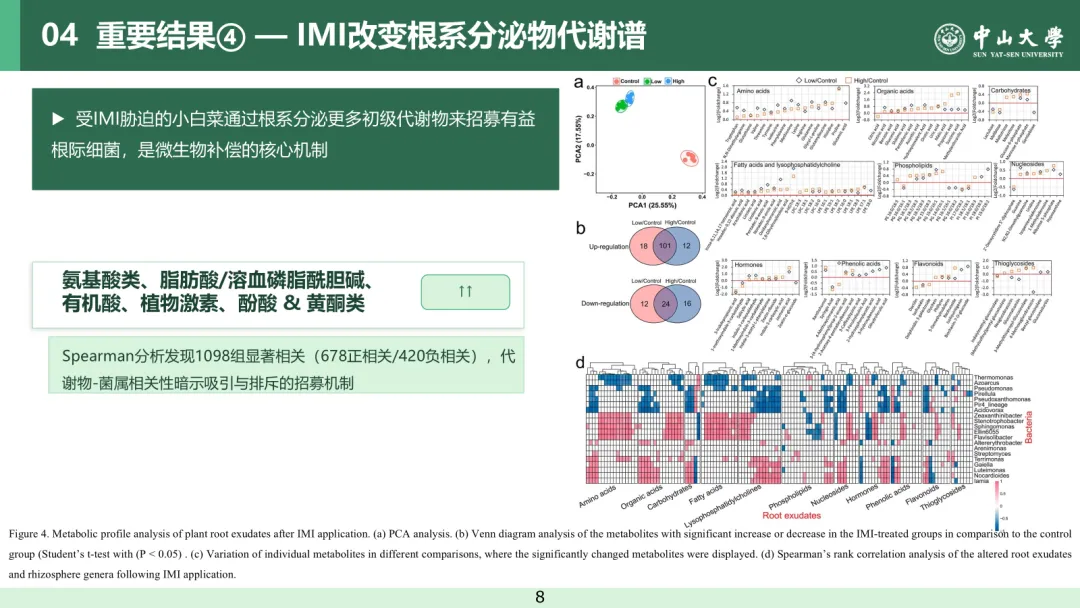 图 4 吡虫啉处理后植株根系分泌物代谢谱分析。(a) 主成分分析(PCA);(b) 吡虫啉处理组与对照组相比显著上调或下调代谢物的韦恩图分析(t 检验,P<0.05;偏最小二乘判别分析,VIP>1);(c) 不同比较组中单个代谢物的变化情况,图中展示差异显著的代谢物;(d) 吡虫啉处理后差异根系分泌物与根际菌属的斯皮尔曼等级相关分析(斯皮尔曼相关,|r|>0.7,P<0.05)。每组设置 5 次重复,误差棒表示标准差。