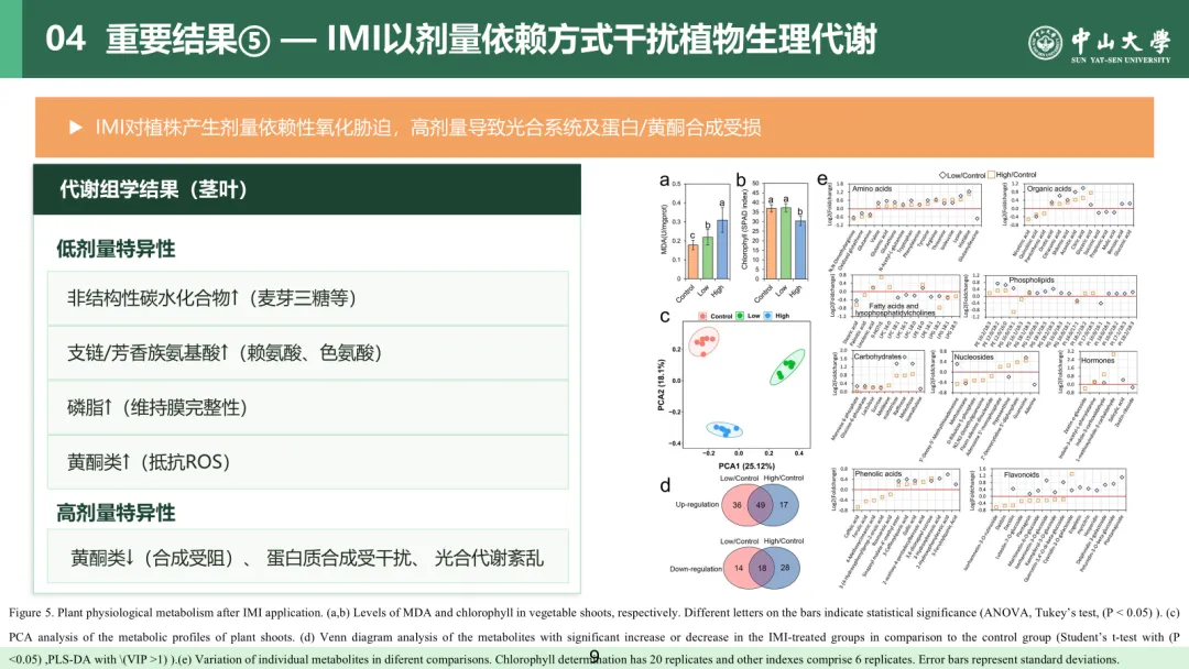 看图例或方法: - 标注为Shoots / Aerial parts→ 茎叶合并。 - 分别标注 Stem、Leaf → 分开检测。 通常代谢组为了整体表征和节约成本,多采用合并地上部。 意义: - 揭示吡虫啉对植物地上部光合、能量、氨基酸、脂质、次生代谢的影响。 - 阐明植物应对农药胁迫的解毒、抗氧化、耐受机制。
