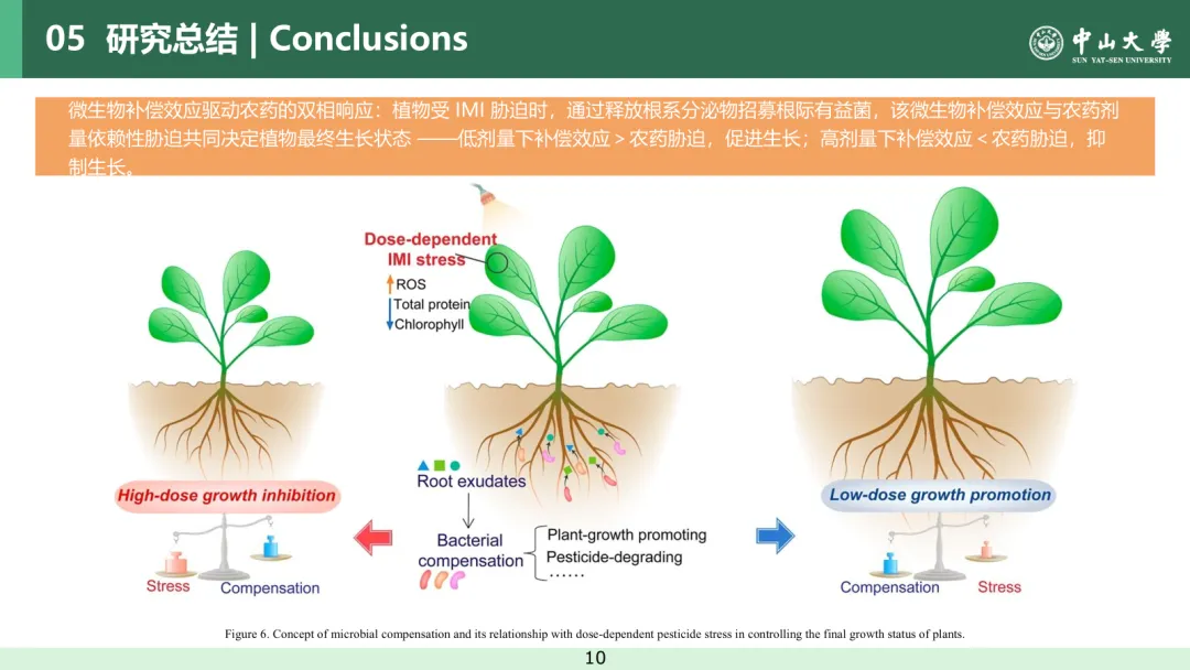 图 6 微生物补偿作用概念及其与剂量依赖性农药胁迫在调控植株最终生长状态中的关联机制。