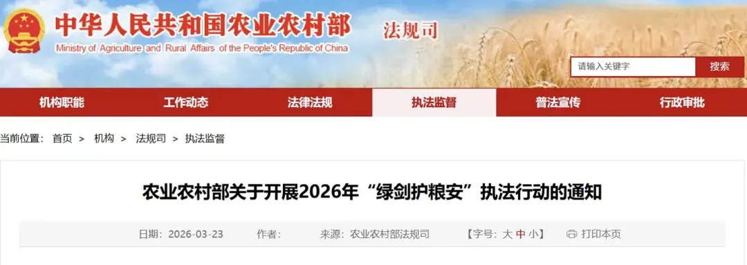 农业农村部部署2026年“绿剑护粮安”执法行动
