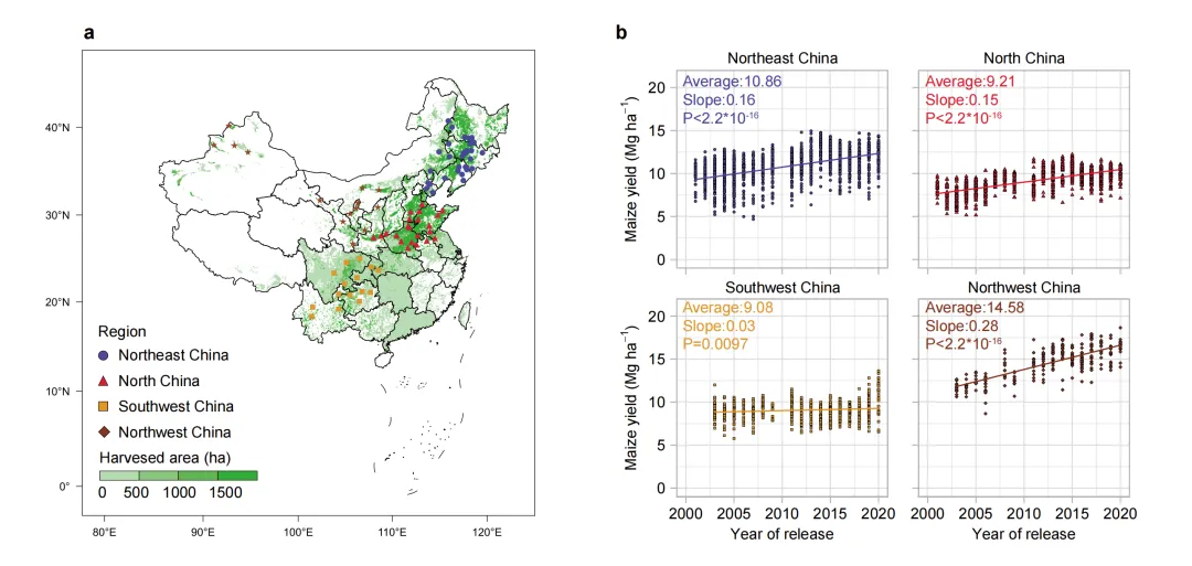 该研究阐明了2001-2020年气候变化背景下品种更新在驱动玉米单产提升与适应极端气候的协同和权衡机制,明确了不同地区玉米高产的关键制约因素并揭示了品种更新如何影响玉米的气候敏感性,展望了因地制宜的培育气候韧性品种对未来玉米单产提升的重要性。