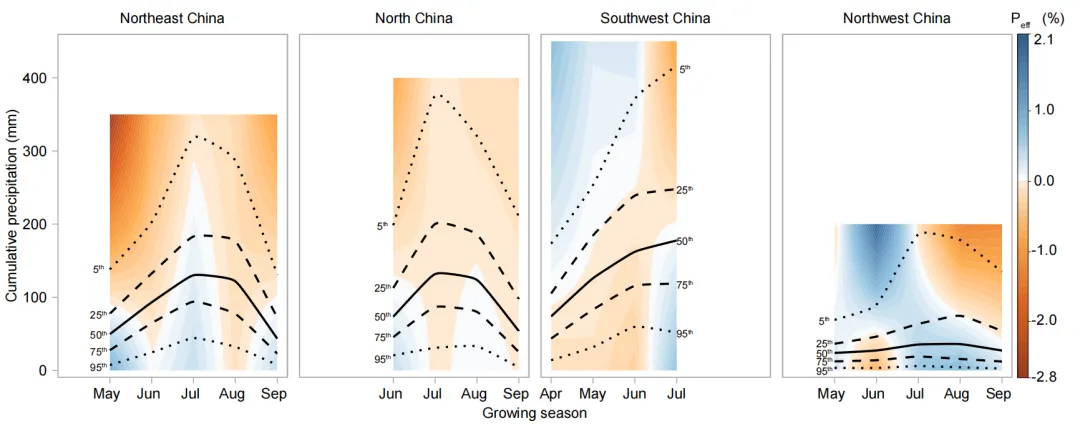 温度和降水对玉米单产的影响存在显著的区域差异与生育期差异。东北地区8 月平均气温由 30℃升至 31℃时,玉米单产将降低 5.2%;华北地区 7—8 月高温胁迫最为突出,其中 7 月和8 月气温较 30℃每升高 1℃,玉米单产分别下降 1.3% 和 2.7%。相比之下,西南地区和西北地区温度增加对玉米单产的不利影响显著小于东北地区和华北地区(图 2)。生育期内降水量增加会对西南地区玉米单产有不利影响,对西北地区则相反(图 3)。研究结果揭示了高温是制约东北地区和华北地区玉米单产的主要因素,降水过多是制约西南地区玉米单产的主要因素,而降雨不足是制约西北地区玉米单产的主要因素。