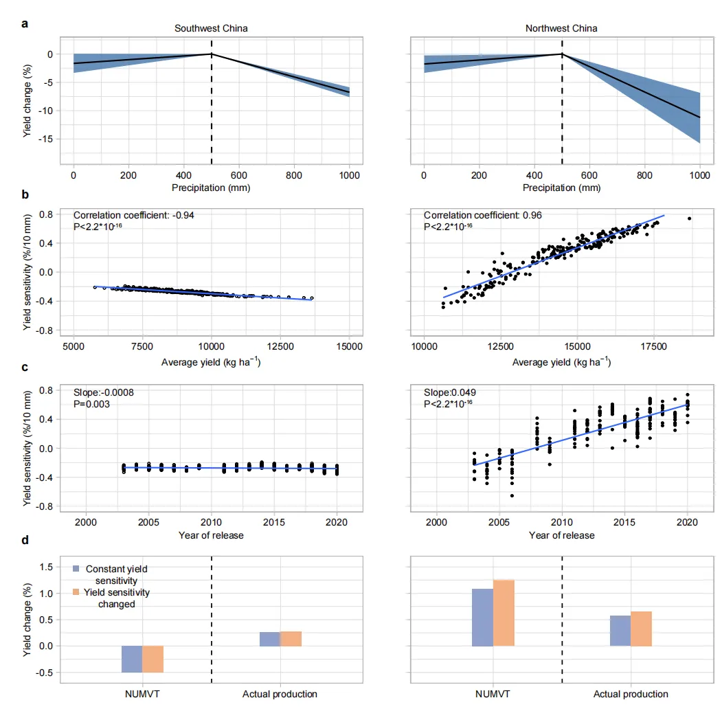 东北地区的高产品种受高温胁迫危害最重,且高温敏感性呈增加趋势,未来受高温胁迫影响产量损失可能进一步加剧,华北地区玉米高温胁迫敏感性随时间整体下降,表明品种更新在提高玉米高温韧性中发挥了重要作用,实际生产数据评估结果反映了同样的趋势(图4)。生育期内降水<500mm时降增加有助于玉米增产,降水不足导致减产,>500mm时,降水过多会导致玉米单产降低。西南地区和西北地区分别因降水过多和不足导致玉米减产。随着品种更新,西南地区和西北地区玉米对降水的敏感性均有所上升,高产品种尤为明显(图5)。