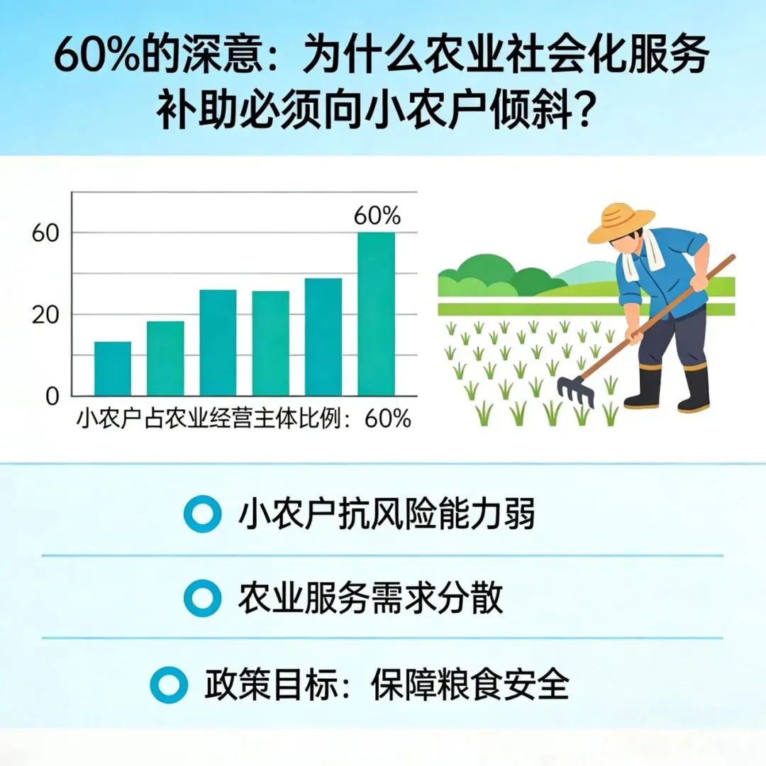 在农业社会化服务项目的政策文件中,有一个数字反复出现:服务小农户的补助资金或面积占比应高于60%。这不是一个随意设定的门槛,而是一个经过深思熟虑的制度安排。