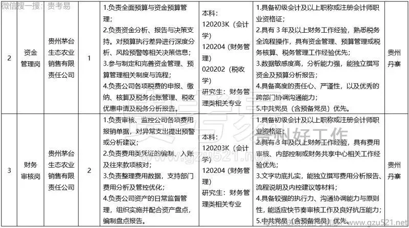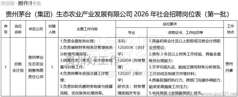 招聘岗位详见附件《贵州茅台(集团)生态农业产业发展有限公司2026年社会招聘岗位表》(第一批)。