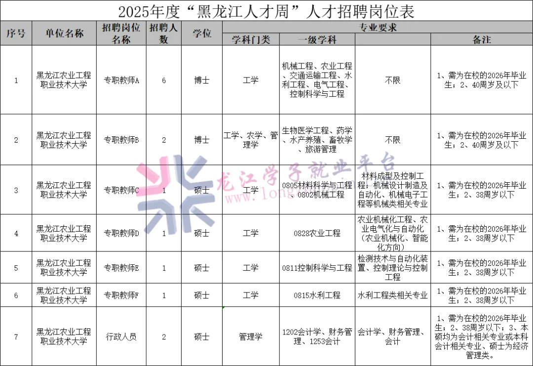本次计划招聘事业单位工作人员共计14名。具体招聘岗位、人数、条件等情况详见《黑龙江农业工程职业技术大学2025年度“黑龙江人才周”人才招聘岗位表》(附件1)。