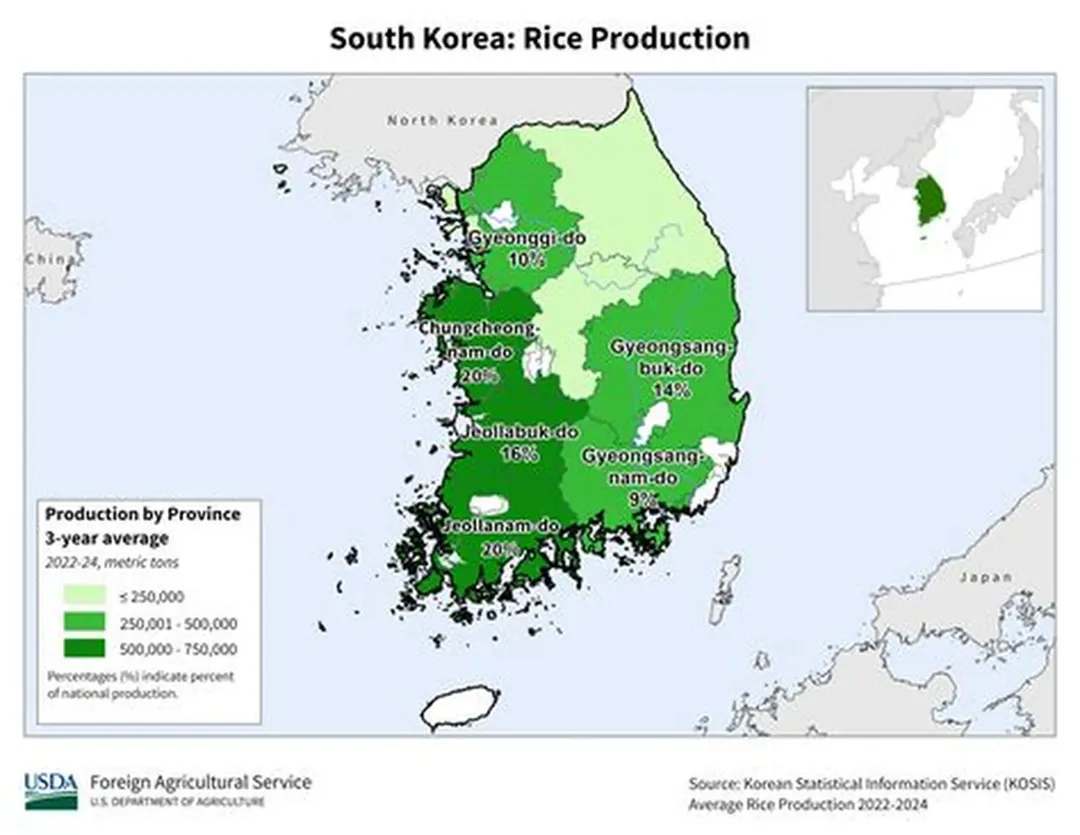 根据韩国统计厅数据,2025年韩国大米产量预计为