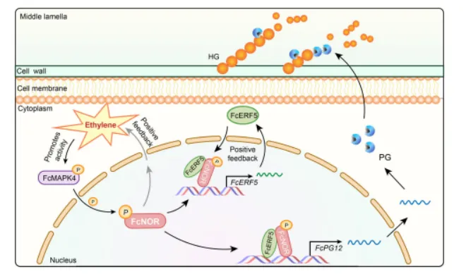 Rapid softening of fig (Ficus carica L.) fruit during ripening leads to extremely short shelf life; the regulatory mechanisms underlying this process remain largely unknown. Fig softening during ripening is largely attributed to pectin degradation, and we identified FcPG12 as the crucial polygalacturonase gene involved in the process. We then identified a NAM (ATAF1/2-CUC2) transcription factor, termed FcNOR and sharing 53.09% amino acid identity with Solanum lycopersicum NOR, which binds directly to the promoter ofFcPG12 to activate its transcription. The activity of FcNOR increased robustly following FcMAPK4 phosphorylation of Ser-78 and Ser-343, which are essential for FcNOR DNA binding and transcriptional activity, respectively. Ethylene also enhanced FcMAPK4 kinase activity and promoted FcNOR phosphorylation, leading to the latter's elevated activity. APETALA2/Ethylene Response Factor 5 (FcERF5) functioned as a transcriptional activator of FcPG12 expression, which was synergistically enhanced by interaction between FcNOR and FcERF5. Moreover, FcNOR binds to the promoter of FcERF5, increasing the latter's transcription and forming a FcNOR–FcERF5 positive-feedback loop. Collectively, integration of ethylene signaling with MAPK-mediated phosphorylation by the FcMAPK4–FcNOR–FcERF5 regulatory module, leading to transcriptional regulation of FcPG12 expression to drive pectin degradation, reveals new insights into the mechanism of fruit softening.