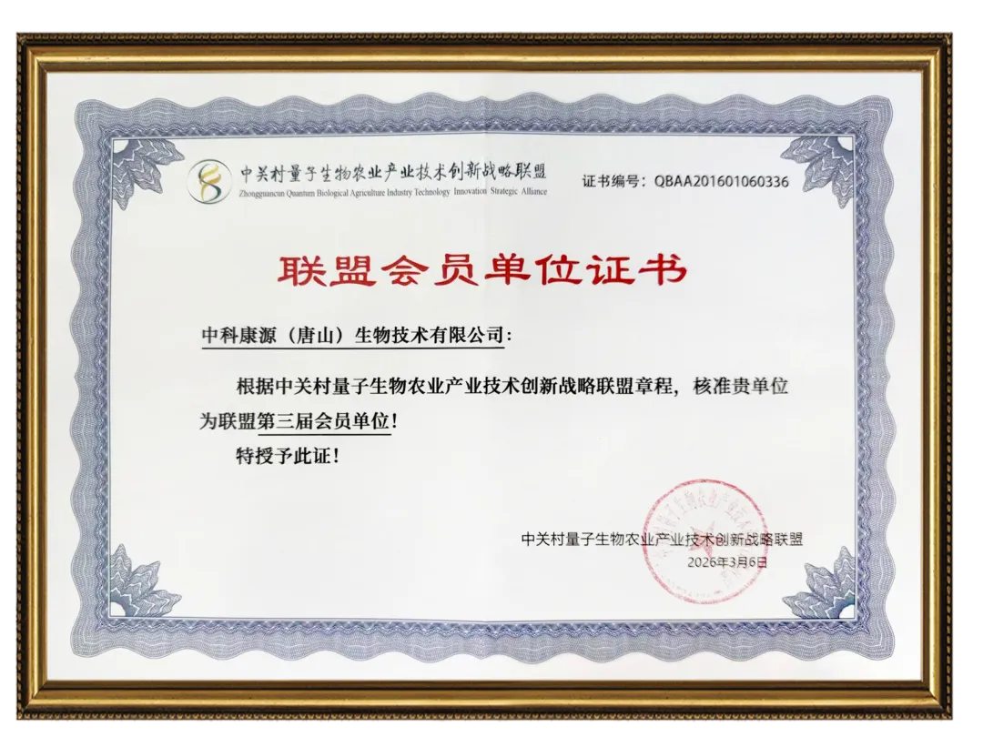 近日,中科康源(唐山)生物技术有限公司凭借在生物农业领域的突出技术实力与行业影响力,正式获批成为中关村量子生物农业产业技术创新战略联盟第三届会员单位。这一资质的取得,是行业对中科康源技术创新能力与产业贡献的权威认可,也标志着企业在生物农业赛道的发展迈入全新阶段。