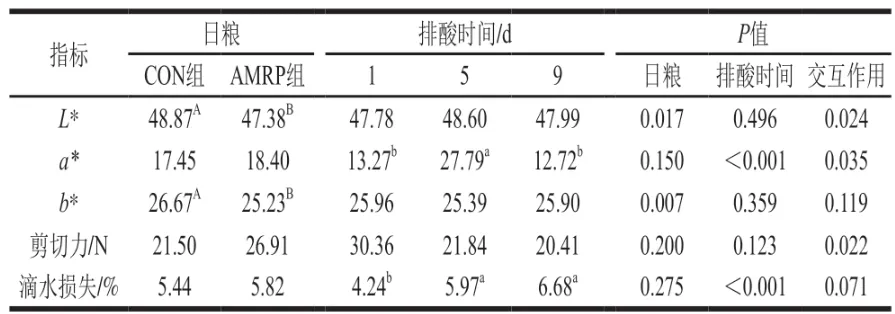 由表3可知,日粮×排酸时间的交互作用对脂肪含量有极显著影响(P<0.001)。与CON组相比,AMRP组的脂肪含量显著提高8.82%(P<0.05)。随着排酸时间的延长,水分含量极显著降低(P<0.001),脂肪含量和粗蛋白含量极显著升高(P<0.001)。综上所述,日粮中添加20 g沙葱粉有利于脂肪的沉积,随着排酸时间的延长,脂肪和粗蛋白含量显著升高。