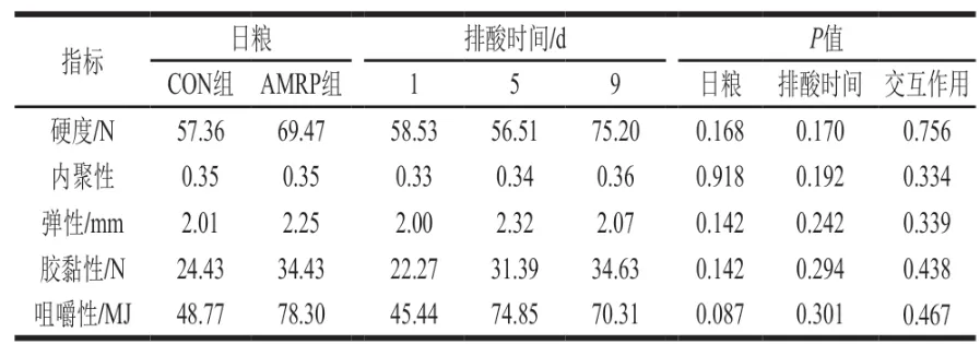 由表2可知,日粮×排酸时间对牛肉质构特性均无显著影响(P>0.05)。