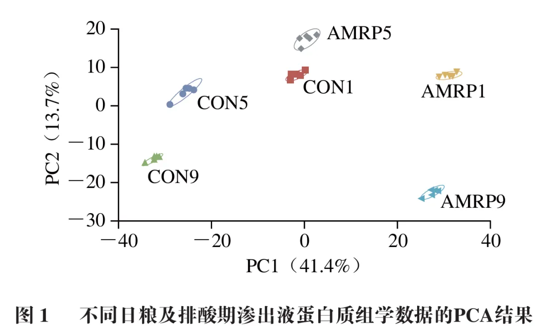 对3个排酸时间段渗出液的蛋白质组学结果进行主成分分析(PCA),如图1所示,PCA显示CON组(CON1、CON5、CON9)和AMRP组(AMRP1、AMRP5、AMRP9)蛋白质之间存在显著差异(PC1为41.4%,PC2为13.7%)。