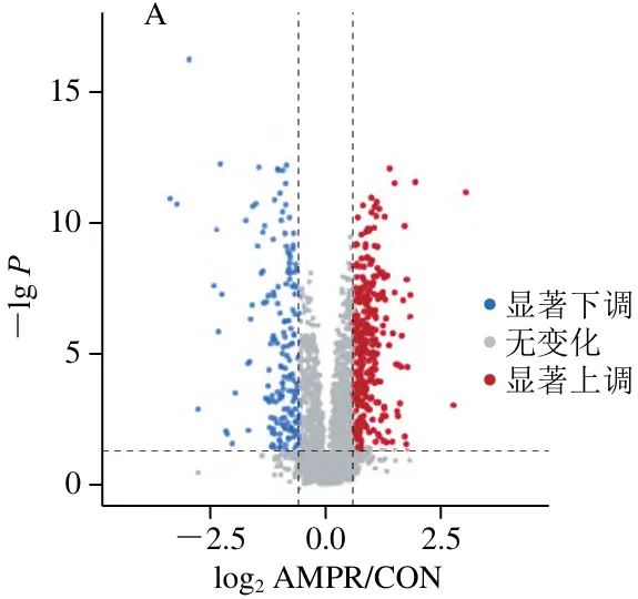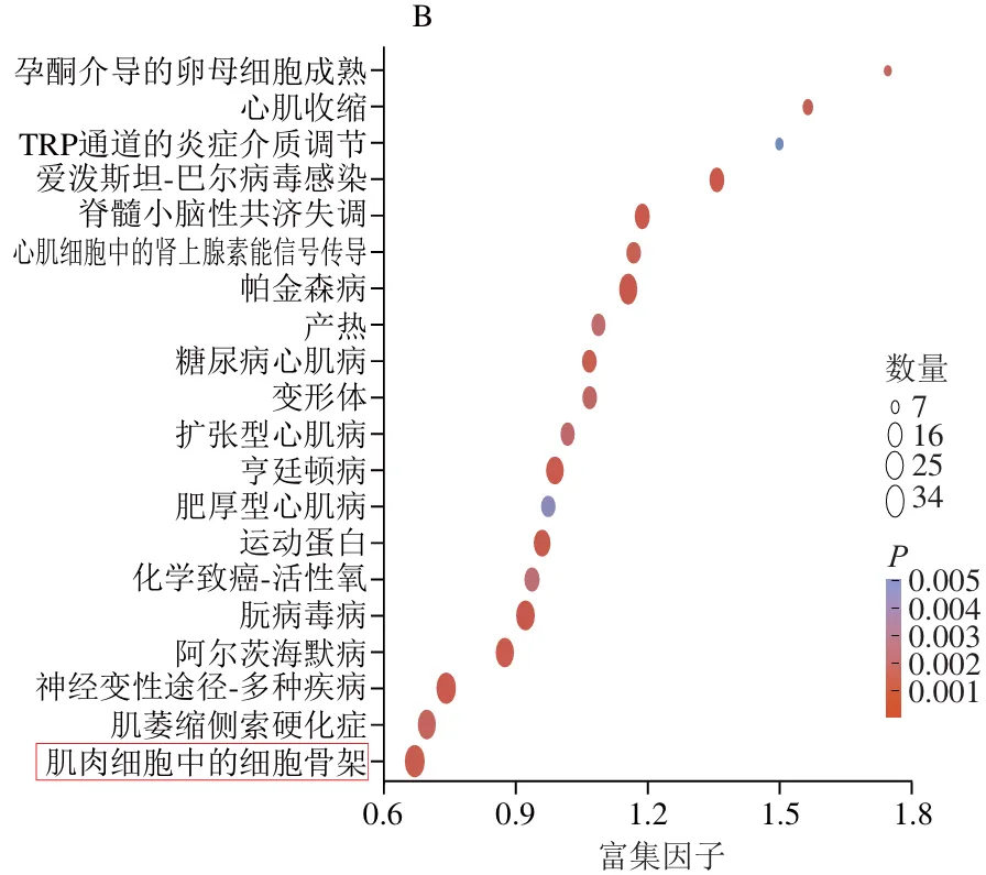 如图4B所示,排酸第5天,AMRP组相比于CON组,显著富集到20 个KEGG通路,其中阿尔茨海默病(P=0.000 1)、神经变性途径-多种疾病(P=0.000 2)、亨廷顿病(P=0.000 04)、肌肉细胞中的细胞骨架(P=0.000 6)最为显著。