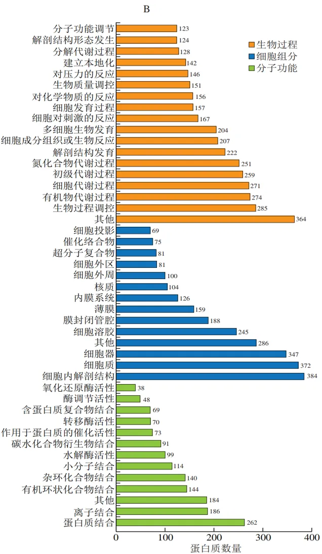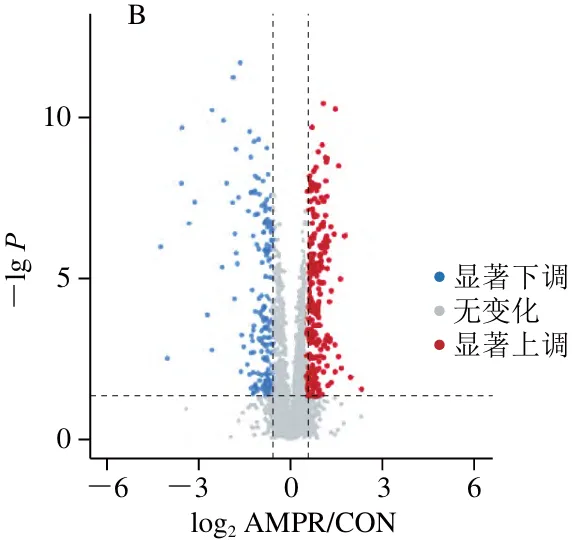 通过GO功能注释对所筛选的差异丰度蛋白质进行生物信息分析,通过生物过程、细胞组分、分子功能3方面解析其功能。如图3A所示,排酸第1天,AMRP组相比于CON组,生物过程中的差异丰度蛋白质主要参与生物过程调控(n=349)、有机物代谢过程(n=316)、细胞代谢过程(n=312)等。细胞组分中的差异丰度蛋白质主要参与细胞内解剖结构(n=457)、细胞质(n=437)、细胞器(n=402)等。分子功能中的差异丰度蛋白质主要涉及蛋白质结合(n=329)、离子结合(n=224)等。