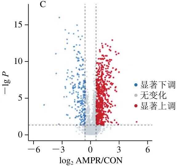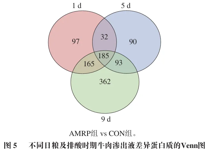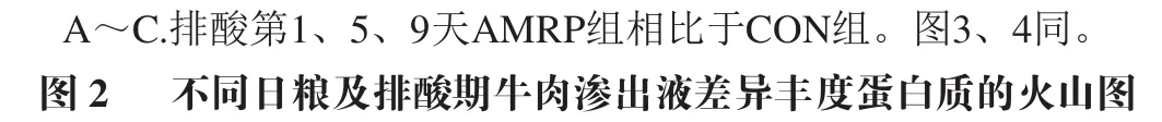 以FC≥1.5且P<0.05为标准筛选差异丰度蛋白质。如图2A所示,排酸第1天,AMRP组相比于CON组,共鉴定出479个显著差异丰度蛋白质,其中,291 个为显著上调,188个为显著下调;如图2B所示,排酸第5天,AMRP组相比于CON组,共鉴定出400个显著差异丰度蛋白质,其中,222个为显著上调,178个为显著下调;如图2C所示,排酸第9天,AMRP组相比于CON组,共鉴定出805个显著差异丰度蛋白质,其中上调561 个,下调244个。