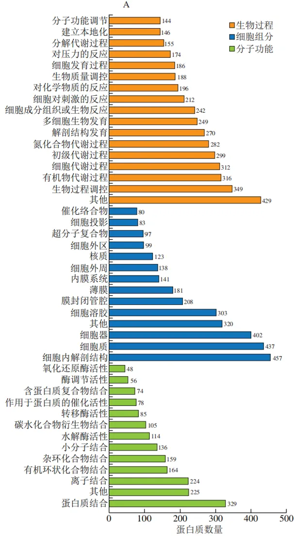 如图3C所示,排酸第9天,AMRP组相比于CON组,生物过程中的差异丰度蛋白质主要参与生物过程调控(n=557)、有机物代谢过程(n=534)、细胞代谢过程(n=522)、初级代谢过程(n=508)等。细胞组分中的差异丰度蛋白质主要参与细胞内解剖结构(n=739)、细胞质(n=713)等。分子功能中的差异丰度蛋白质主要涉及蛋白质结合(n=523)、离子结合(n=372)等。