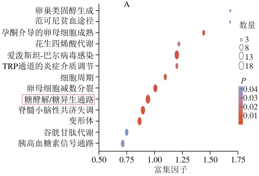 通过KEGG数据库对所筛选的差异蛋白质进行通路注释分析。如图4A所示,排酸第1天,AMRP组相比于CON组,显著富集到13 个KEGG通路,主要KEGG通路包括爱泼斯坦-巴尔病毒感染(P=0.000 02)、糖酵解/糖异生通路(P=0.000 6)、脊髓小脑性共济失调(P=0.001)、卵母细胞减数分裂(P=0.002)、变形体(P=0.005)等。