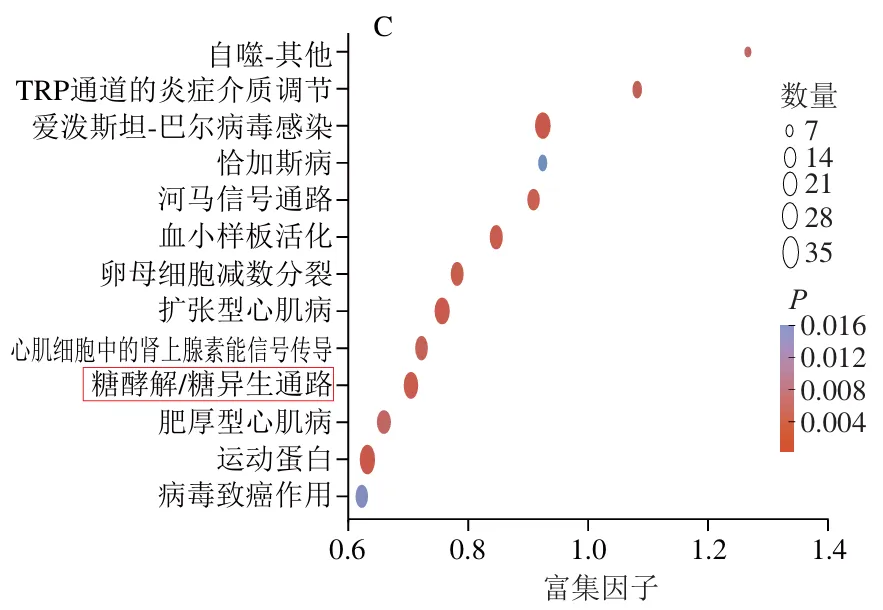 如图4C所示,排酸第9天,AMRP组相比于CON组,显著富集到13 个KEGG通路,主要分布在爱泼斯坦-巴尔病毒感染(P=0.000 02)、扩张型心肌病(P=0.000 5)、糖酵解/糖异生通路(P=0.000 7)、运动蛋白(P=0.000 7)。