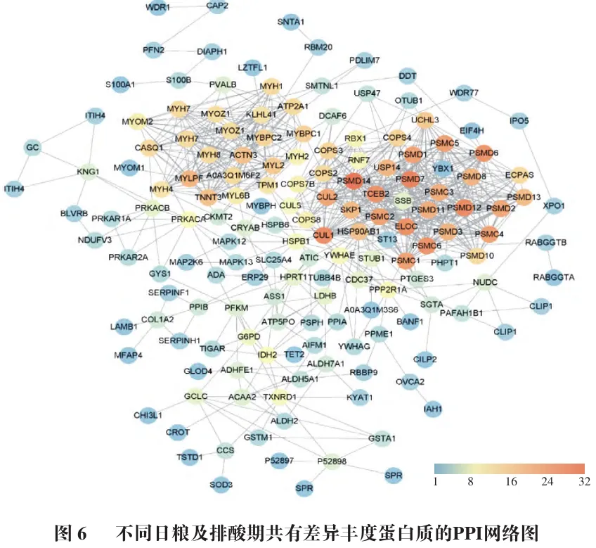 如图5所示,185个蛋白质为3个排酸阶段共有的差异丰度蛋白质。利用String数据库(https://www.string-db.org/)对共有的差异蛋白质进行PPI分析。如图6所示,通过String网站对185个共有的差异蛋白进行PPI网络分析。将PPI网络导入Cytoscape 3.7.2软件中并采用MCODE插件寻找高联通性的子网络,将得分排名前二的子网络的蛋白质拉出并标注注释到最多的KEGG通路,核心网络上共有34个差异蛋白质在糖酵解/糖异生通路、肌肉细胞中的细胞骨架这2个通路上。
