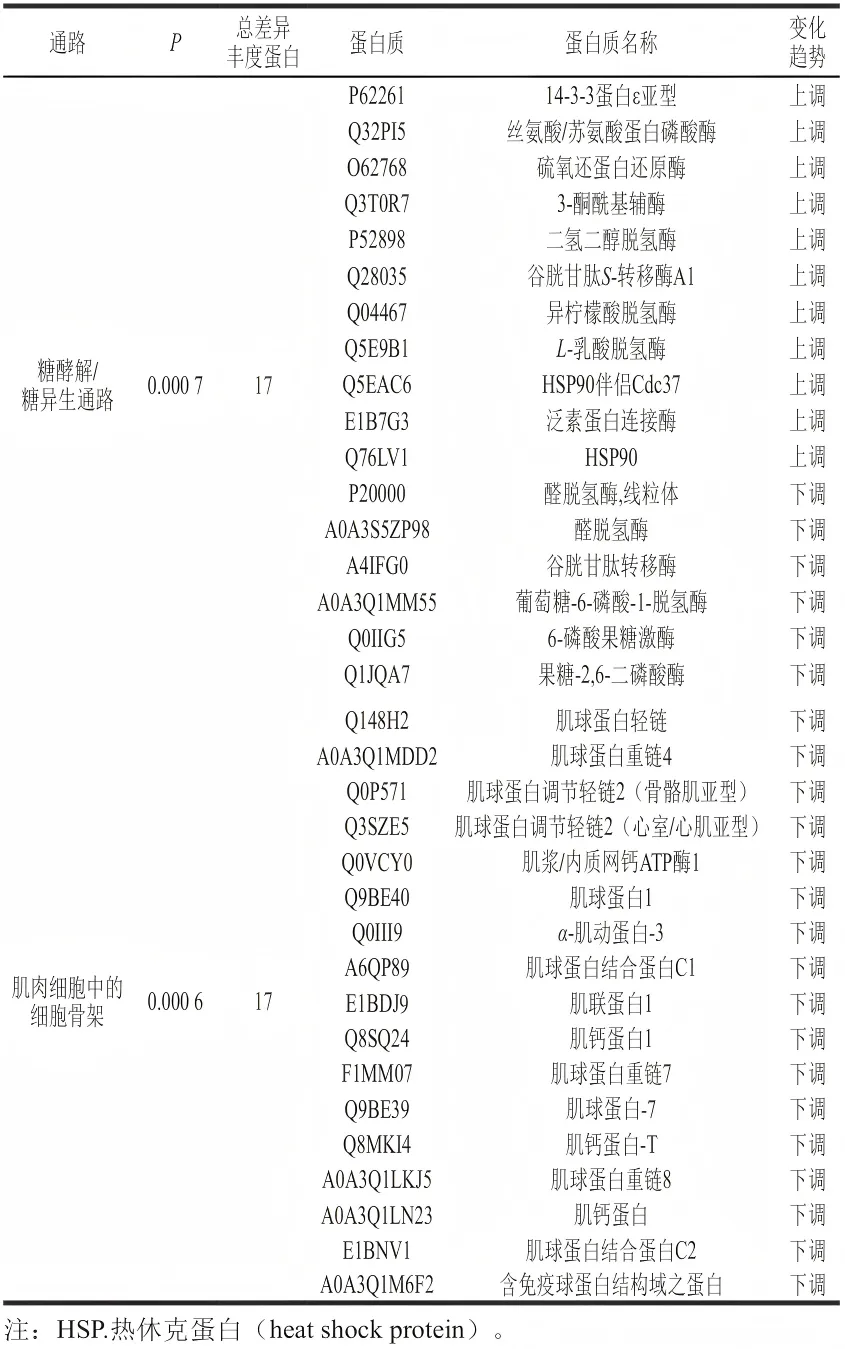 由表5可知,绝大多数蛋白质的表达下调发生在肌肉细胞中的细胞骨架,可能是由于这些结构蛋白质于排酸第5天发生了降解。而糖酵解/糖异生通路中大多数代谢酶上调表达可能是代谢酶可以催化复杂的生理过程(凋亡和自噬),在排酸过程中发挥重要作用。这些蛋白质位于细胞质,参与代谢以及ATP酶活性的调节。
