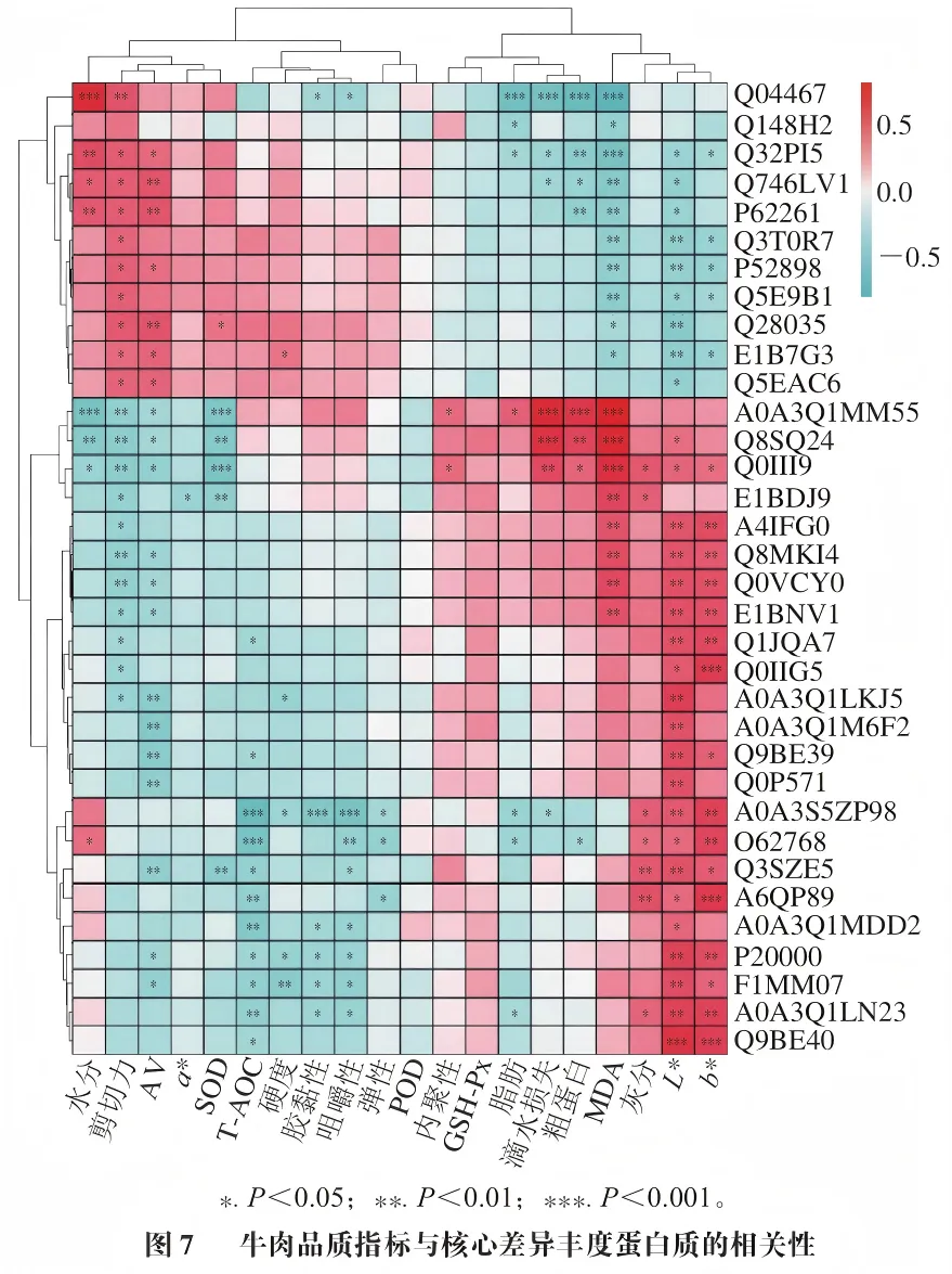如图7所示,L*与Q9BE40呈高度显著正相关(P=0.000 05;ρ=0.625),b*与Q9BE40(P=0.000 7;ρ=0.541)、A6QP89(P=0.000 2;ρ=0.575)、Q0IIG5(P=0.000 4;ρ=0.553)呈高度显著正相关;MDA与Q0III9(P=0.000 02;ρ=0.644)、Q8SQ24(P=0.000 01;ρ=0.711)、A0A3Q1MM55(P=0.000 02;ρ=0.828)呈高度显著正相关;粗蛋白与A0A3Q1MM55(P=0.000 1;ρ=0.588)呈高度显著正相关;滴水损失与Q8SQ24(P=0.000 06;ρ=0.616)、A0A3Q1MM55(P=0.000 06;ρ=0.688)呈高度显著正相关;水分与Q04467(P=0.000 04;ρ=0.696)呈高度显著正相关;L*与A0A3Q1LN23(P=0.001;ρ=0.519)、P20000(P=0.001;ρ=0.552)呈极显著正相关;b*与A0A3Q1LN23(P=0.001;ρ=0.519)呈极显著正相关。