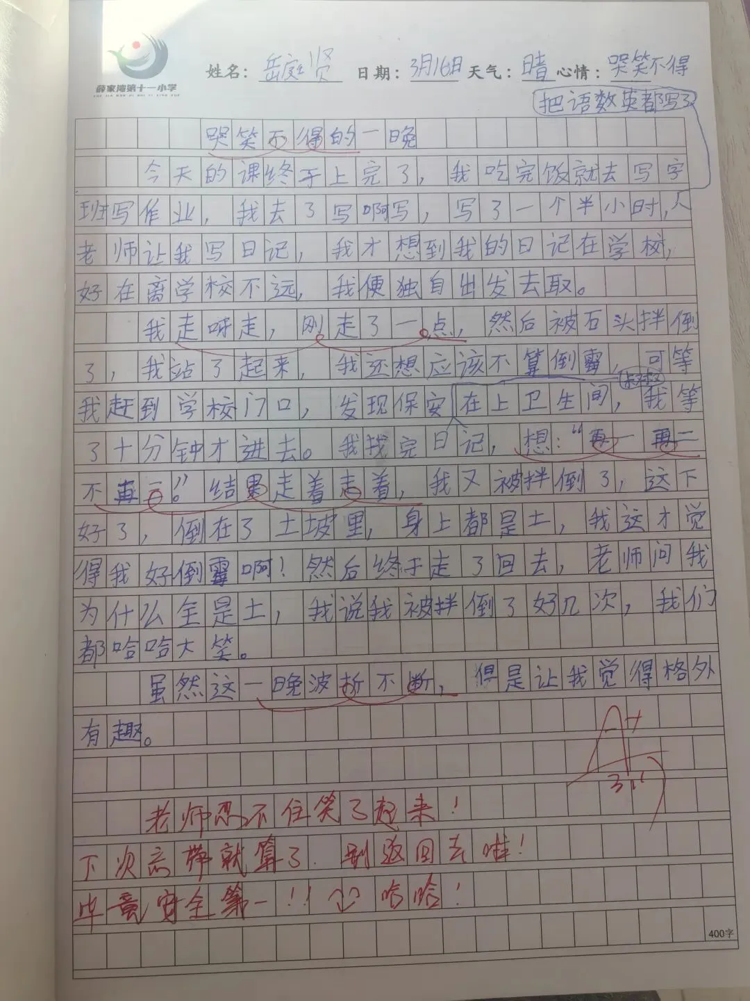 我没有急于求成,更没有用统一的标准苛求他们,而是像农人守护禾苗般,顺着孩子的天性慢慢引导。写作教学上,我从不强求华丽的辞藻,先从一句心里话、一段身边的小事教起。比如那天课后服务,快下课孩子们开始记当天作业,当我说到“今天的免作业卡…”话还没说完,一个孩子突然打个喷嚏,声音超级大,全班都笑了,我顺势说“孩子们,快观察,同学们都是怎么笑的?”孩子们有的说“前仰后倒”,有的说“捂着嘴”,有的说“手舞足蹈”…我接着说“对呀,这就是把如何笑写丰富了”…
