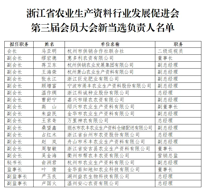 随即召开三届一次理事会、三届一次监事会。选举产生新一届协会负责人。杭州市供销合作社联合社二级巡视员马亚明当选为第三届理事会会长;惠多利农资有限公司董事长缪宏德、杭州供销农业发展集团有限公司副总经理蒋卫东、杭州萧山农业生产资料有限公司副总经理王海荣、宁波市甬丰农业生产资料股份有限公司副总经理顾增富、浙江科诚种业股份有限公司总经理温作绸等15家企业当选为副会长;杭州市农业生产资料有限公司副总经理俞洲君当选为秘书长;金华苗知地知农业科技有限公司董事长叶倩当选为监事长;湖州益农农资连锁有限公司总经理严玉良、温州安心农资有限公司总经理卢国火当选为副监事长。