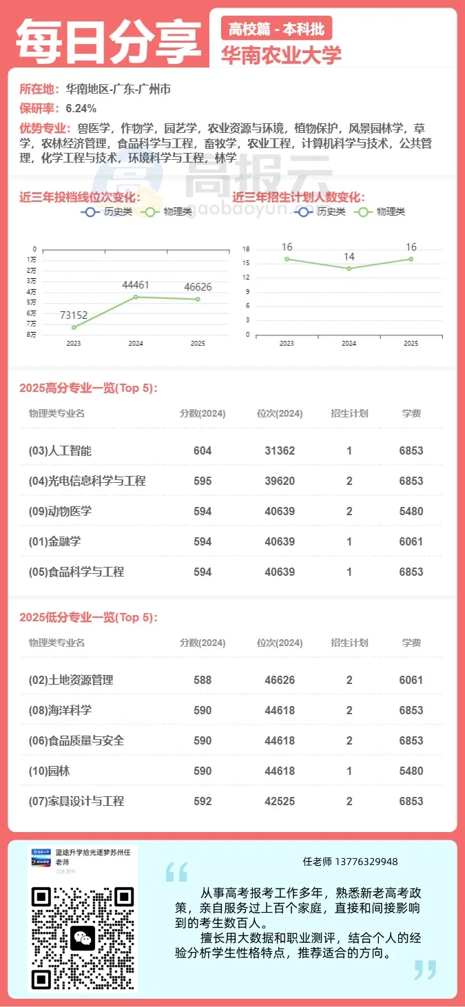 学校2024年普通高考招生计划9160人(含不分省预留计划182人),招生总计划同比2023年增加80人,实际录取9155人。在广东省提前批次物理类招生计划60人,录取60人,最高分589分,排位29426,近三年我校提前批生源质量稳定。广东省本科批次物理类招生计划4252人,实际录取4346人;历史类招生计划2129人,实际录取2167人。各专业组生源充足,所有专业组均一次性满档,生源质量稳中有升。物理类最高分621分,排位10787,录取到动物医学(丁颖创新班)专业,最低排位同比2023年前进2122名。历史类最高分587分,排位4942,录取到法学专业,艺术类统考科目招生计划587人,实际录取596人,生源质量总体稳定。学校在省外20个新高考改革的省(自治区、直辖市)招生中,我校理科投档最低分超过当地该批次投档控制线100分以上的地区有17个。
