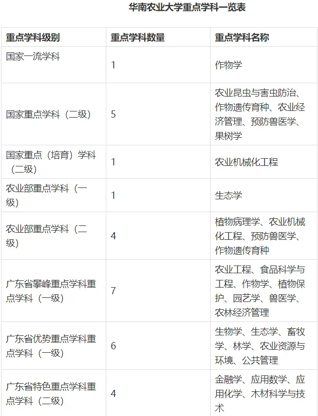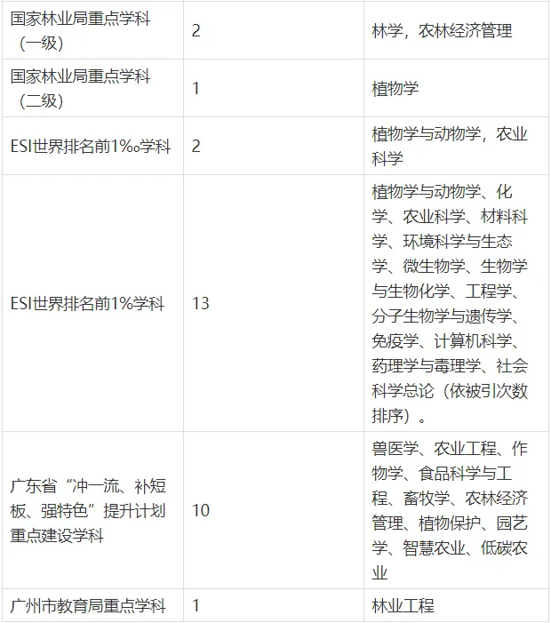 截至2025年9月,作物学入选国家“双一流”建设学科,获批10个广东省高水平大学建设计划重点建设学科。植物学与动物学、农业科学进入ESI全球排名前1‰;植物学与动物学、化学、农业科学、环境科学与生态学、材料科学、工程学、生物学与生物化学、微生物学、分子生物学与遗传学、免疫学、计算机科学、药理学与毒理学、临床医学、社会科学(依被引次数排序)14个学科进入ESI全球排名前1%。农学和兽医学位列软科世界一流学科排名全球第6位、食品科学与工程位列全球第20位。农业与林学位列QS2025世界大学学科排名全球第28位。