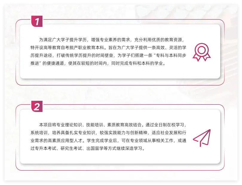 培养模式:高等学历继续教育专科学历+高等教育自学考试本科毕业证书。符合报考条件可插本拿全日制文凭。