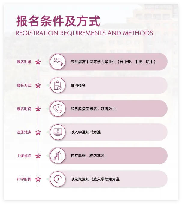 招生对象:应、往届高中/中专、技校毕业生及同等学历人员