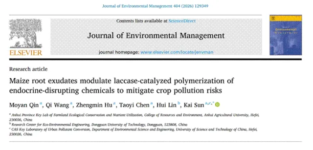 近日,安徽农业大学资源与环境学院孙凯教授团队在环境领域权威期刊《Journal of Environmental Management》(影响因子IF=8.4)上发表题为“Maize root exudates modulate laccase-catalyzed polymerization of endocrine-disrupting chemicals to mitigate crop pollution risks”的研究论文(全文链接:https://doi.org/10.1016/j.jenvman.2026.129349)。该论文由学院2022级本科生覃莫砚担任第一作者,孙凯教授担任通讯作者。研究系统解析了玉米根系渗出物(M-REs)对漆酶催化内分泌干扰物(EDCs)聚合反应的调控机制,并通过温室盆栽试验明确了漆酶催化聚合过程对玉米吸收、转运EDCs的阻控效应。相关成果为构建基于漆酶调控的可持续根际修复技术体系提供了理论支撑,对保障作物安全生产、降低农产品污染风险具有重要的科学指导意义。
