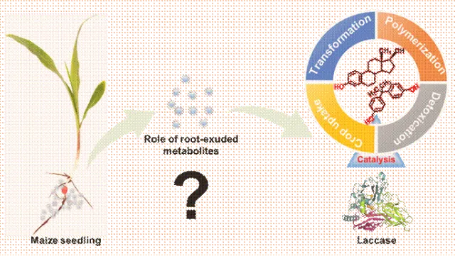 在传统农业生态系统中,EDCs通过畜禽养殖废水灌溉、生活污水回用、有机肥还田等多种途径持续输入农田环境,对作物生长发育与农产品质量安全构成潜在威胁。由于EDCs具有高疏水性、化学稳定性及低浓度生物活性等特性,其在土壤环境中难以被土著微生物完全降解,极易被玉米根系吸收并在可食用部位富集,最终通过食物链传递引发人体健康风险。漆酶催化聚合反应能高效转化EDCs,并促进其与M-REs组分发生共聚反应,进而显著降低污染物的生物有效性与迁移性。然而,国际学术界针对M-REs调控漆酶催化EDCs转化的研究仍缺乏系统性解析,尤其对M-REs在酶促反应中的功能角色、共转化中间产物的结构特征及环境行为等关键科学问题尚不清楚(图1)。