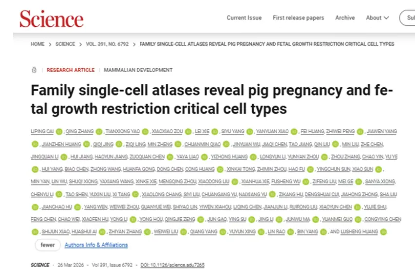 2026年3月27日,国际顶尖学术期刊《Science》在线刊登了一项由中国科研团队独立完成的里程碑式研究。这项研究由江西农业大学猪遗传改良与种质创新全国重点实验室的黄路生院士团队主导,是《Science》创刊以来,中国在猪遗传育种领域首篇以国内单位为唯一完成单位发表的长篇研究论文,标志着我国在该基础研究领域取得了历史性突破。