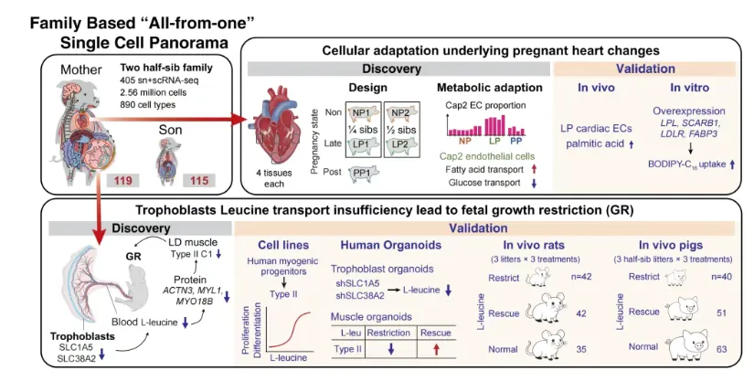 在我国生猪养殖中,胎儿生长受限(FGR)发生率高达5-20%,每年导致至少3500万头仔猪发育不良,不仅造成巨大经济损失,也关乎人类类似妊娠并发症的研究。团队利用猪一胎多仔的优势,对比分析了正常与生长受限的全同胞胎猪。