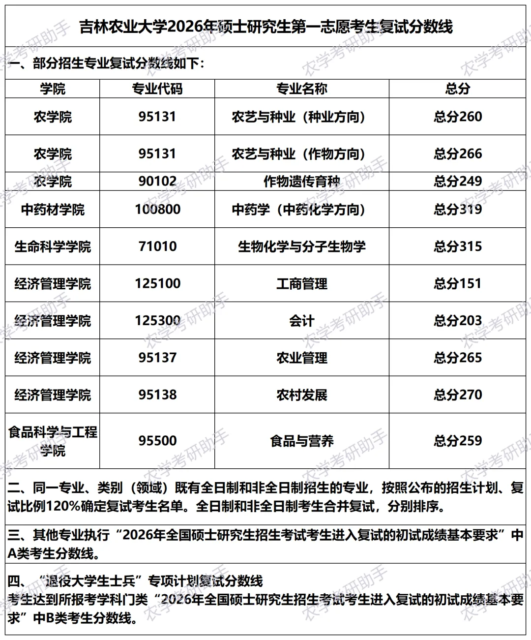 吉林农业大学2026年硕士研究生第一志愿考生复试分数线