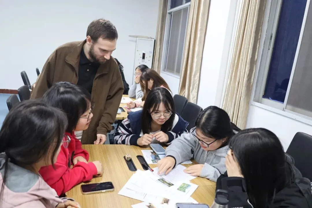 接着,外教Michael带来沉浸式跨境分享,介绍自家矿业小镇曾因产业破坏生态,经治理后重焕美景,还讲述个人大学生活与校园特色。同学们积极互动提问,深入了解异国乡镇风貌与海外校园,现场跨文化交流氛围热烈融洽。