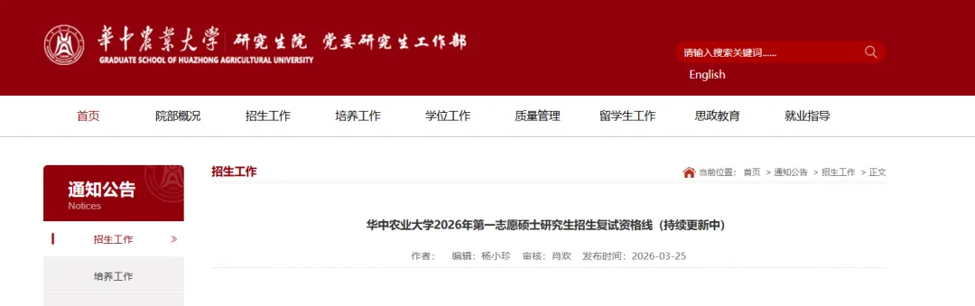>王牌专业复试线暴跌90分!华中农业大学2026年复试分数线分析