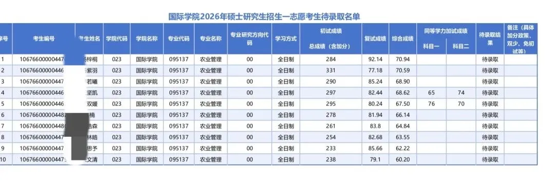 国际学院农业管理全日制,一志愿待录取了整整10名考生,初试成绩(含加分)最低分仅233分,最高分331分,大部分考生的初试分数都集中在260-300分这个区间,甚至有多名考生初试分数低于农学类国家线,依然拿到了待录取资格;复试成绩更是全程高分,最低分都有77.18分,绝大多数考生复试分都在80分以上,最高复试分直接冲到92.14分,综合成绩最低60.20分就能上岸,哪怕初试分数垫底,只要复试好好准备,都能顺利录取,完全没有“初试高分刷人”的情况,招生名额充足,容错率拉满。
