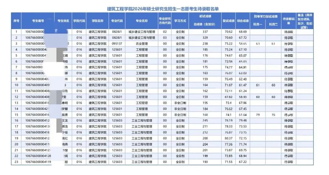 再看建筑工程学院农业管理,虽然只待录取了1名考生,但分数门槛低到离谱:初试成绩仅238分,复试成绩75.22分,综合成绩58.65分就成功待录取,哪怕是同等学力考生,加试科目一63分、科目二61分这种刚过合格线的分数,也顺利拿到了录取资格,完全没有卡分、卡学历的情况,复试打分宽松,初试门槛极低,属于“只要敢报、好好准备,就有机会上岸”的程度。