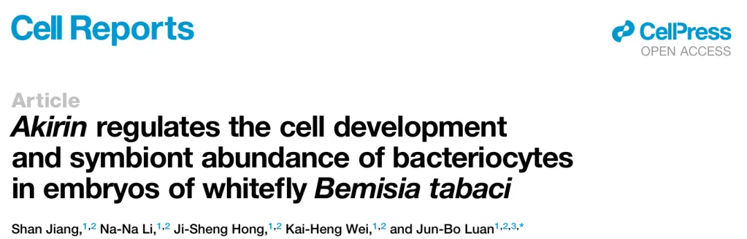 近日,沈阳农业大学栾军波团队在国际权威期刊《Cell Reports》上发表了题为《Akirin regulates the cell development and symbiont abundance of bacteriocytes in embryos of whitefly Bemisia tabaci》的研究论文 。该研究以烟粉虱(Bemisia tabaci)为模型,结合单细胞转录组测序与 RNA 干扰(RNAi)技术,首次揭示了非转录因子基因 Akirin 在胚胎期不仅调控含菌细胞的迁移与分裂,还能通过影响抗菌肽 defensin 的表达来控制共生菌的滴度 。这一发现为理解新型宿主细胞的发育调控及互利共生关系的维持机制开辟了全新的方向 。