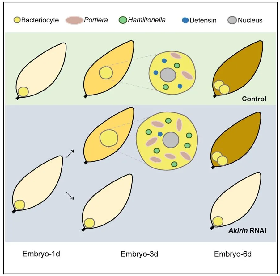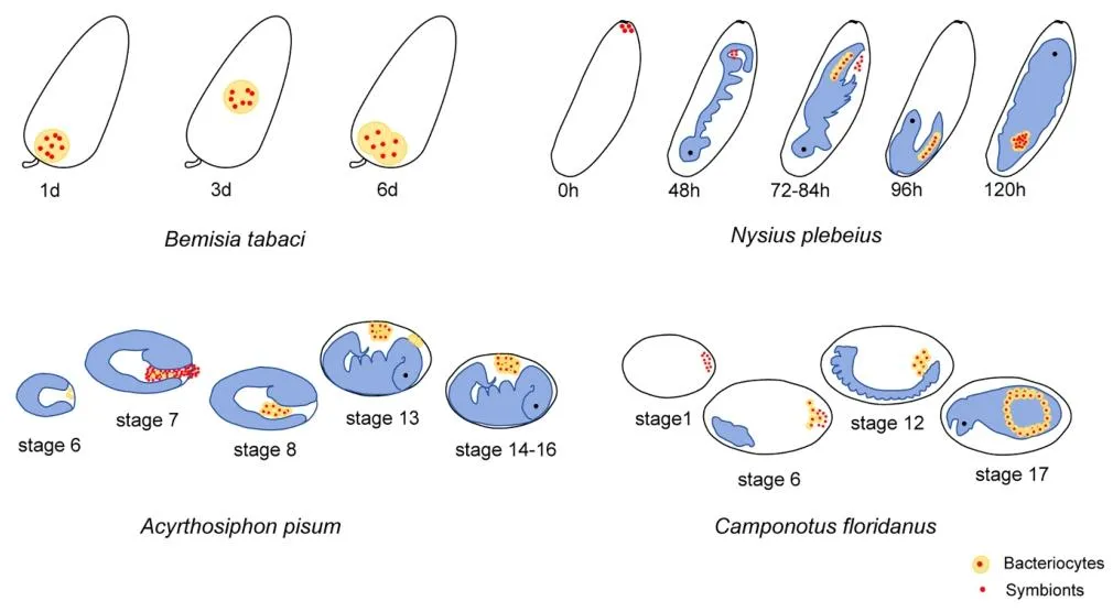 昆虫体内存在特化的宿主细胞——含菌细胞(Bacteriocytes),用于容纳胞内共生菌 。在昆虫胚胎发育过程中,含菌细胞的发育动态及其内部共生菌丰度的调控机制一直是共生学领域的未解之谜 。