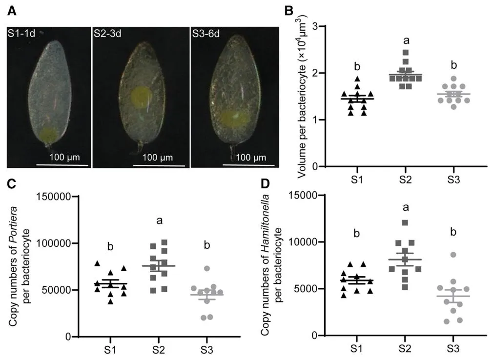 在烟粉虱的胚胎发育过程中,含菌细胞表现出规律的空间位置转移和体积变化 。在胚胎发育第 1 天(S1 阶段),单个含菌细胞位于胚胎尾部;至第 3 天(S2 阶段)迁移至胚胎中部;而到了第 6 天(S3 阶段)则移回尾部并分裂为两个独立细胞 。与此同时,含菌细胞的体积以及内部特异性共生菌(Portiera 和 Hamiltonella)的滴度均呈现出高度一致的波动:从 S1 到 S2 阶段逐渐增加,随后在 S3 阶段显著下降 。这种同步的动态特征表明,含菌细胞的发育与其内部共生菌的丰度调控存在紧密的生理关联 。