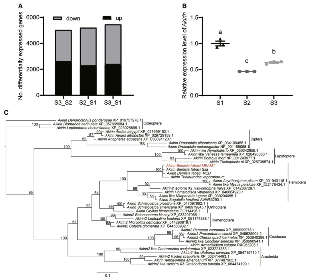 为了解析上述周期性动态背后的分子机制,研究团队对处于三个不同发育阶段的胚胎含菌细胞进行了单细胞转录组测序分析(scRNA-seq) 。通过筛查在含菌细胞中高表达且在不同阶段存在显著差异表达的基因序列,研究人员锁定了保守的基因 Akirin。定量表达分析证实,Akirin 基因的转录水平与共生菌的滴度变化轨迹呈现完美的负相关 。系统发育与序列结构分析进一步表明,Akirin 蛋白在多种半翅目昆虫中具有极其保守的进化起源和核定位信号,提示其具备参与细胞发育与免疫调节双重功能的巨大潜力 。
