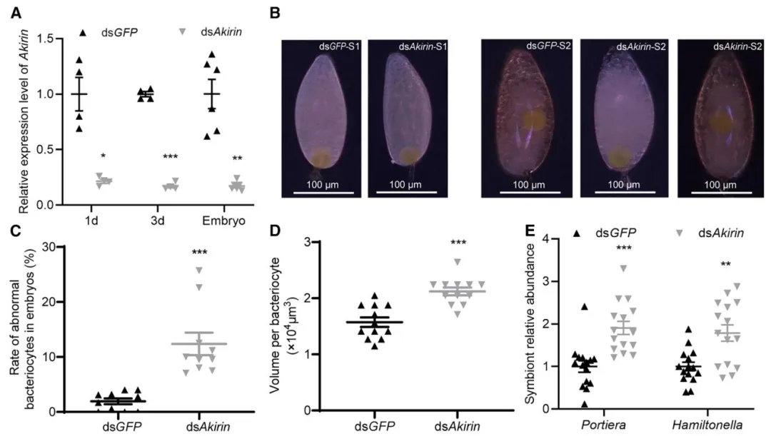 为明确 Akirin 的实际生物学功能,研究人员利用显微注射技术在母代成虫体内实施了 Akirin 的 RNA 干扰(RNAi)操作 。基因敲降后,子代胚胎中的含菌细胞遭遇了严重的迁移障碍,部分含菌细胞异常滞留于胚胎尾部,导致胚胎发育停滞并无法孵化 。对于那些仍能继续发育的胚胎而言,Akirin 的缺失使其含菌细胞的体积发生异常膨胀,同时细胞内 Portiera 和 Hamiltonella 共生菌的滴度出现了极显著的异常飙升 。这些强烈的生理表型直接证明了 Akirin 基因在驱动含菌细胞正常形态重塑和抑制共生菌过度繁殖中发挥着不可或缺的作用 。