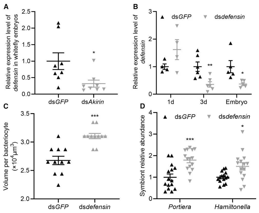 Akirin 敲降所引发的共生菌失控现象促使研究团队进一步深挖其下游的免疫效应网络 。在评估了烟粉虱基因组编码的抗菌肽后发现,敲降 Akirin 基因会特异性地导致抗菌肽防御素(defensin)的表达量出现大幅度衰减 。通过直接对 defensin 基因实施靶向 RNAi 敲降,研究人员完美复刻了此前 Akirin 缺失时的病理表型:胚胎含菌细胞的体积显著增大,且两种核心共生菌的滴度急剧攀升 。这确凿地证实了 Akirin 是通过正向激活下游抗菌肽 defensin 的表达,在含菌细胞内充当了控制共生菌数量的“免疫刹车器” 。