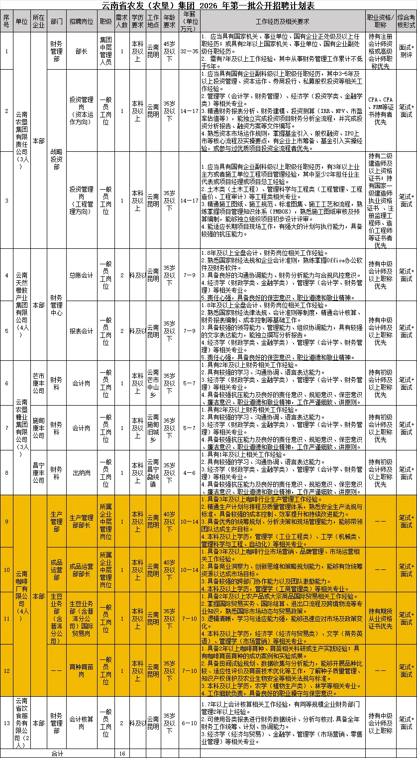 具体招聘岗位及要求详见《云南省农发(农垦)集团2026年第一批公开招聘计划表》(附件1)。